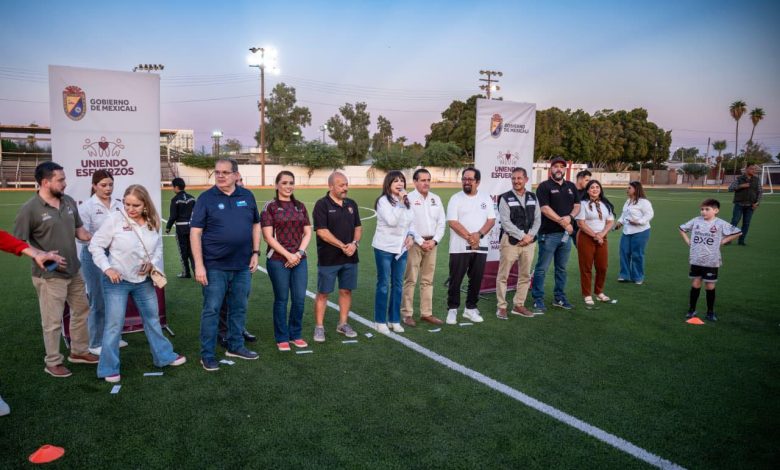 MEXICALI, B.C., AGOSTO 20 DE 2025.- Con el fin de ofrecer más y mejores espacios públicos para la juventud, la presidenta municipal, Norma Bustamante, encabezó el acto de reapertura del campo de fútbol «Boticas Pérez», popularmente conocido como Campo Necaxa, ubicado en la Colonia Nueva de esta capital.