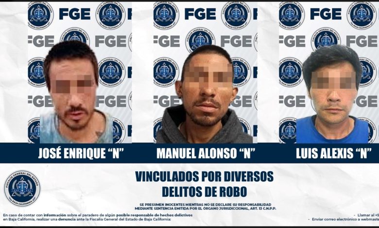MEXICALI, B.C., DIC. 31 DE 2025.- Las Unidades de Investigación con Detenidos Poniente y de Robos Poniente, obtuvo la vinculación a proceso de tres hombres imputados por su presunta participación en los delitos de robo con violencia en grado de tentativa, robo calificado en contra de bienes de institución educativa y robo calificado cometido con violencia.