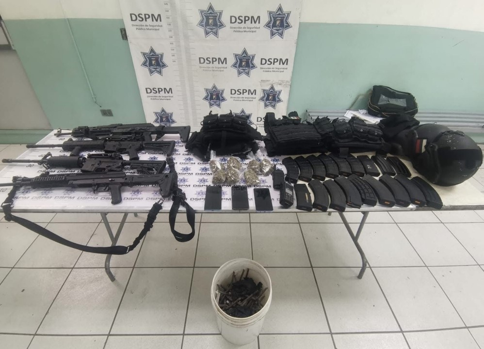 Tras una inspección al interior de la camioneta se lograron localizar cuatro armas largas, tres chalecos balísticos, 18 cargadores para arma larga abastecidos, dos radios de comunicación, cuatro teléfonos celulares, tres cascos, siete bolsas con marihuana; también se encontró una cubeta con artefactos hechizos conocidos como “poncha llantas”.