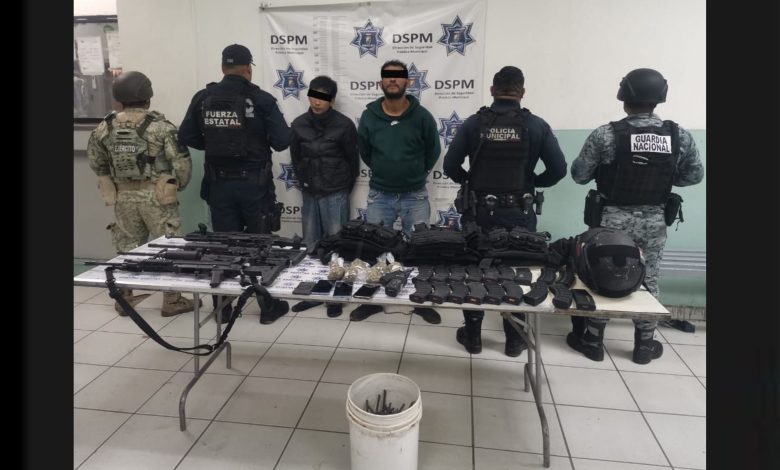 MEXICALI, B.C., ENE. 04 DE 2026.- Una llamada al 9-1-1 por parte de un ciudadano, y la coordinación entre instituciones de seguridad en Mexicali, permitieron la detención de dos hombres que se encontraban en posesión de armas largas, cargadores para arma abastecidos, equipo táctico, entre otros artefactos que les fueron asegurados tras una persecución.