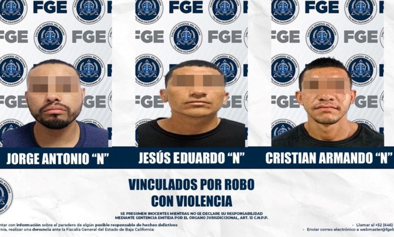 MEXICALI, B.C., ABR. 07 DE 2026.- Tres hombres presuntamente involucrados en robos con violencia contra establecimientos comerciales, fueron vinculados a proceso con base en los elementos de prueba presentados por la Fiscalía Regional de Mexicali, a través de la Unidad de Investigación de Robo Poniente.